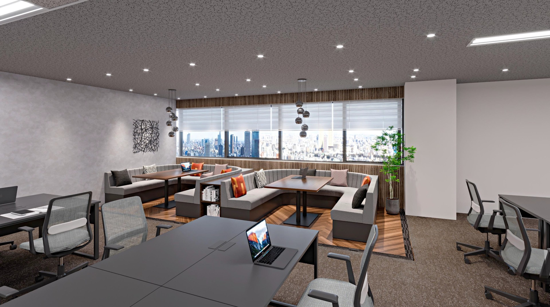 窓際には開放的なソファブースを配置し、執務の合間にリフレッシュできる空間も確保。