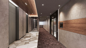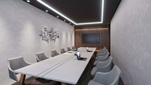 • 重厚感あるダークトーンの内装が企業の信頼感を演出
