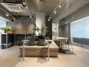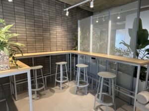 最大の魅力は、コンクリート打ちっぱなしの天井とグリーンが調和したデザイナーズラウンジです。ソファ席、カウンター席、ボックス席など多彩な座席レイアウトにより、気分転換やカジュアルなミーティングにも活用できます。