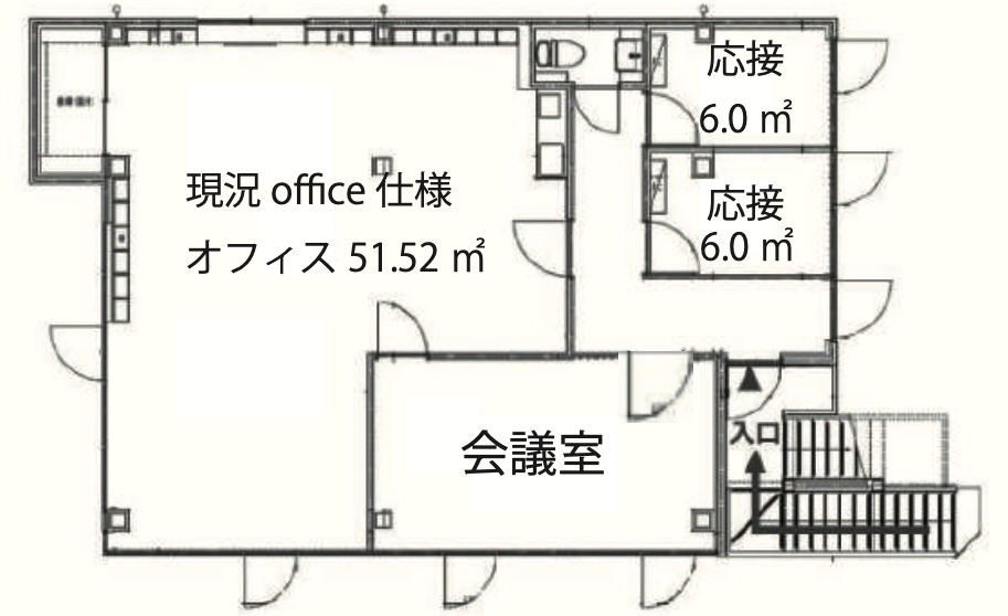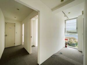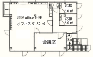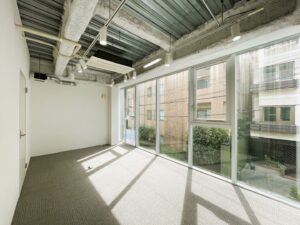 メインのワークエリアは効率的なレイアウトが可能な間取りで、少人数チームから中規模組織まで柔軟に対応できます。独立した会議室が2室あり、クライアントとの商談や社内ミーティングを同時並行で進められる機能性も備えています。各会議室には十分な採光があり、圧迫感のない快適な打ち合わせ環境を実現しています。
