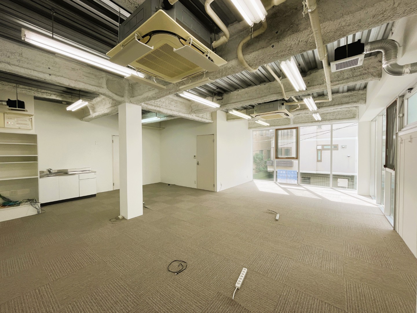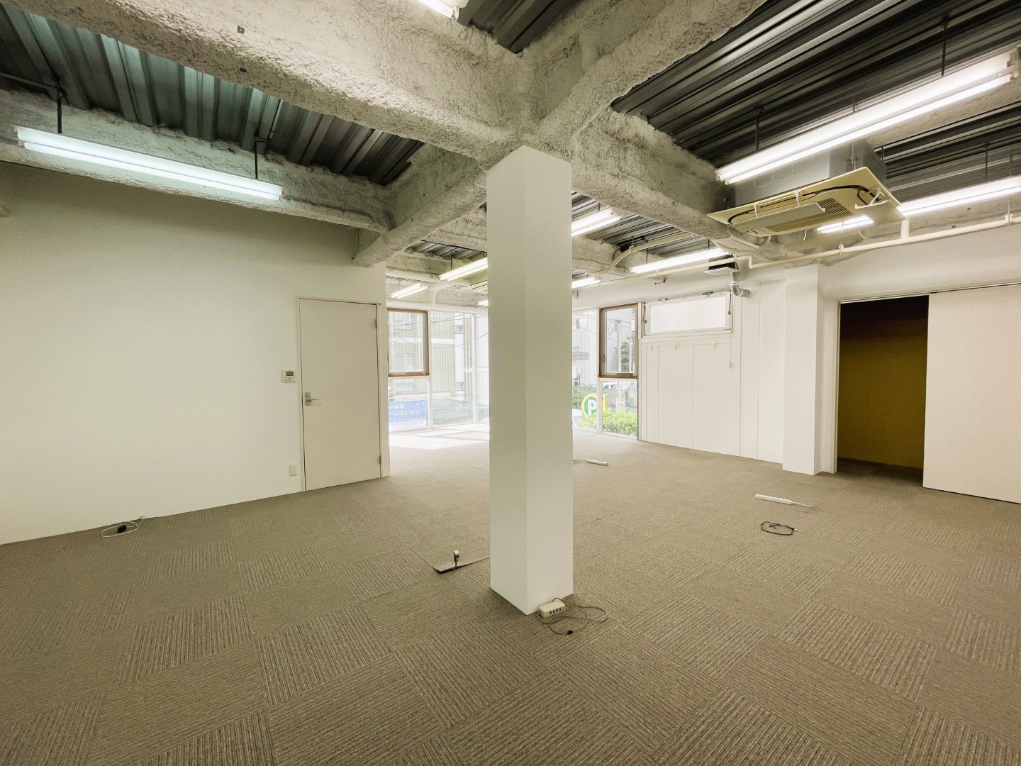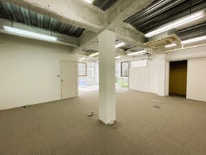 白を基調とした清潔感あふれる外観は、訪れる方に洗練された印象を与えます。専用の外階段を上がってアクセスする独立性の高い構造は、プライバシーを重視する企業にとって大きな魅力となるでしょう。室内に足を踏み入れると、天井まで広がる大きな窓から注ぐ自然光が、空間全体を明るく照らし出します。露出したコンクリート天井とダクトが生み出すモダンな雰囲気は、従業員の創造性を刺激し、生産性の高い業務環境を提供します。