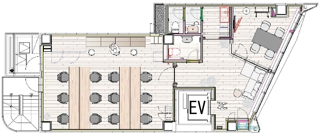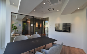 執務スペースは木目調のフローリングと白を基調とした内装で統一され、明るく開放的な雰囲気を演出。コンクリート現しの天井が都会的な洗練さを加えており、クリエイティブな発想を刺激します。ガラスパーティションで仕切られた会議室は採光性に優れ、窓からの自然光が室内を明るく照らすため、長時間のミーティングでも疲れにくい環境です。専用トイレは男女別・洋式で、他テナントと共用する必要がなく、衛生面でも安心してご利用いただけます。