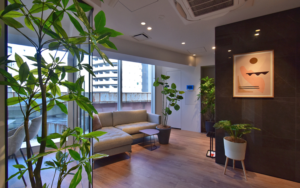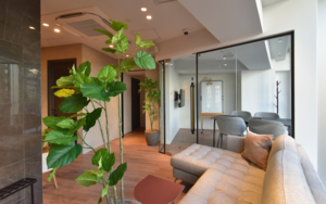 木目調とグリーンが調和した空間デザインは、訪れる人に心地よさと洗練された印象を与え、企業のブランドイメージ向上にも貢献します。
