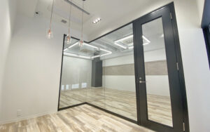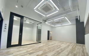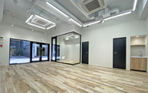 室内は温かみのある木目調の床材に、スクエア型のスタイリッシュな照明を配したデザイン性の高い空間。視認性の良いガラス張りの会議スペースが既に設けられており、開放感を保ちながら機能的なレイアウトを実現しています。