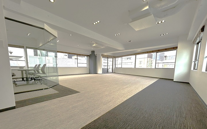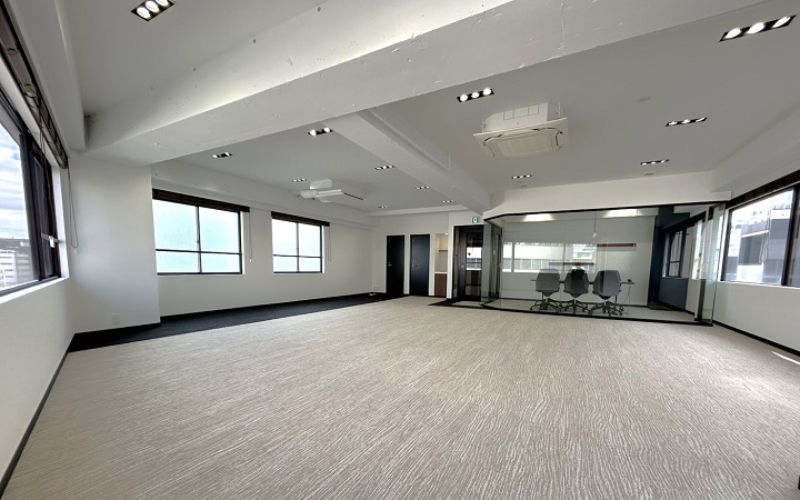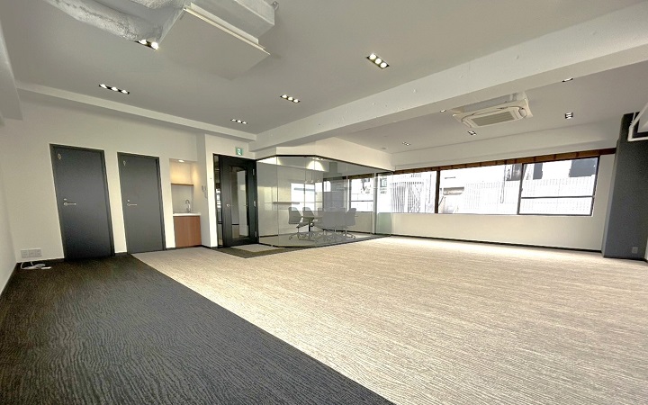 室内はガラスの間仕切りを用いた会議室があらかじめ設置されており、デザイン性と機能性が両立。大きな窓からは自然光がたっぷりと差し込み、明るく開放的な雰囲気の中で業務に励むことができるでしょう。