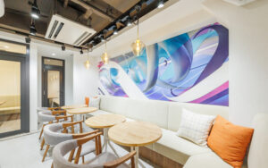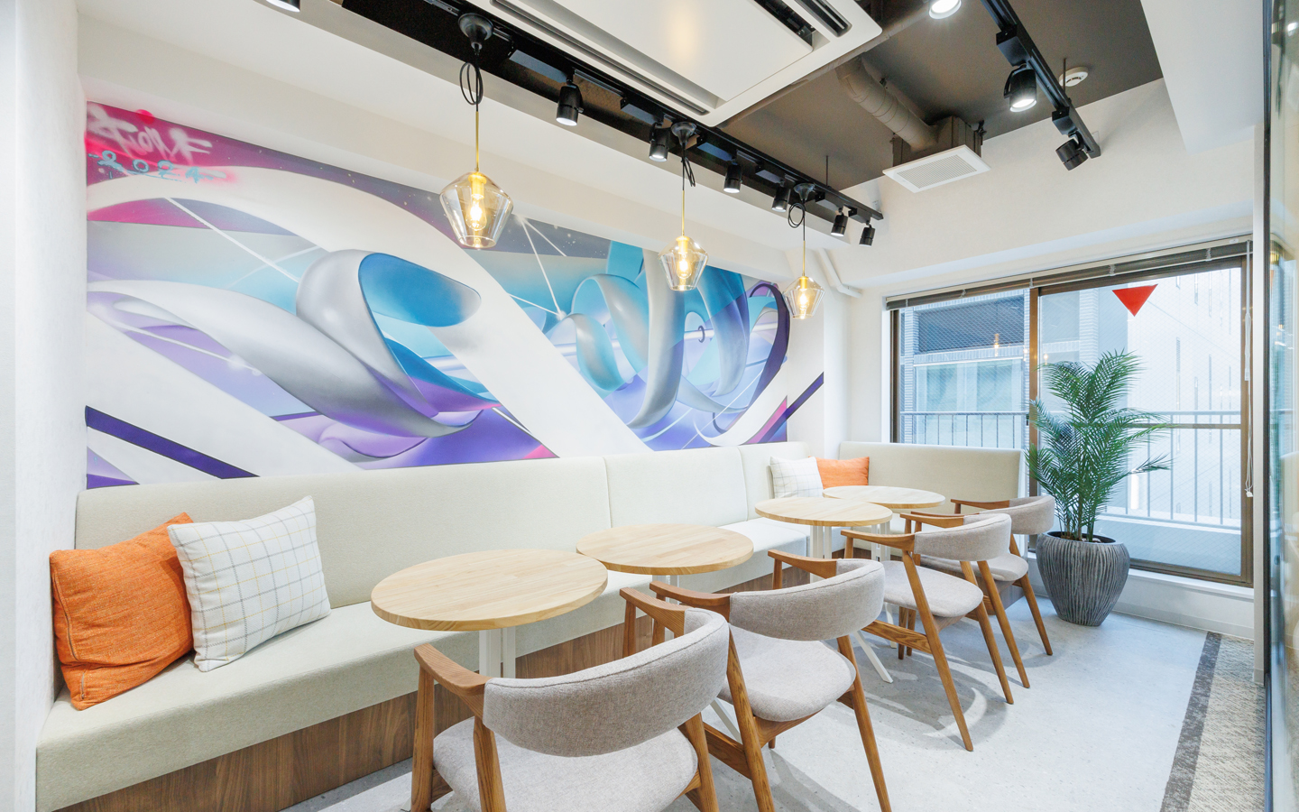 室内は、壁面のグラフィックアートや温かみのある木目調の什器が印象的な、モダンで遊び心のある空間です。