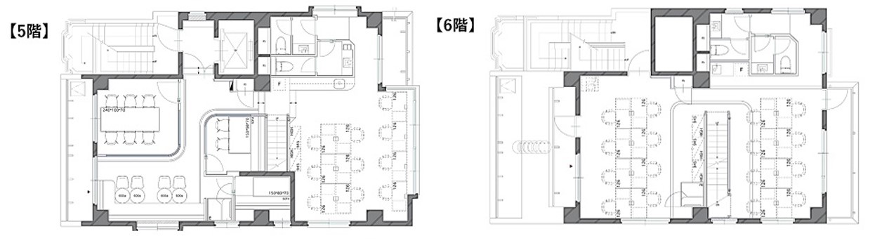 2フロアを一体として利用できるため、執務スペースと来客・リフレッシュスペースを明確に分けるなど、機能的なレイアウトを実現できます。ガラスパーテーションで仕切られた会議室は、開放感を保ちつつプライバシーも確保されており、社内外のコミュニケーションを円滑にします。