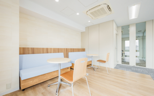 リラックススペースやカウンター席も設けられており、多様な働き方に対応。木目調の天井デザインやモダンな家具が、洗練された雰囲気を演出します。