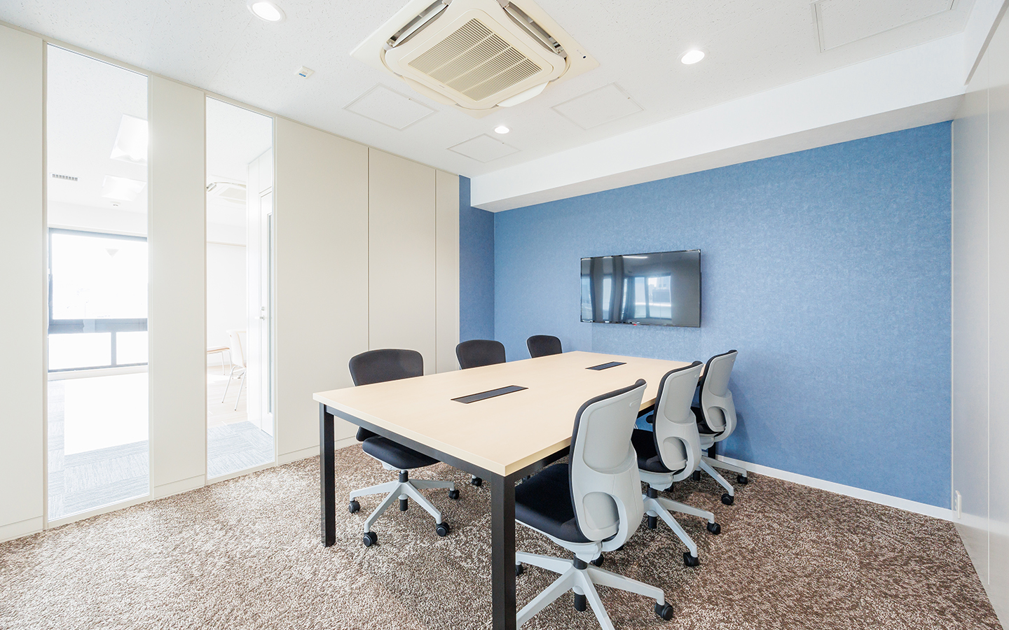 ガラス張りの会議室はブルーのアクセントウォールが印象的で、来訪者にも好印象を与えます。