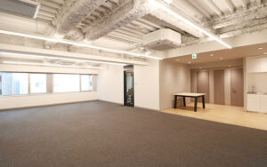 室内は、会議室やラウンジスペースが最初から造作されているため、入居時の手間やコストを大幅に抑えることが可能です。デスクエリアは落ち着いた色調のタイルカーペットが敷かれ、配線作業もスムーズに行える仕様となっています。