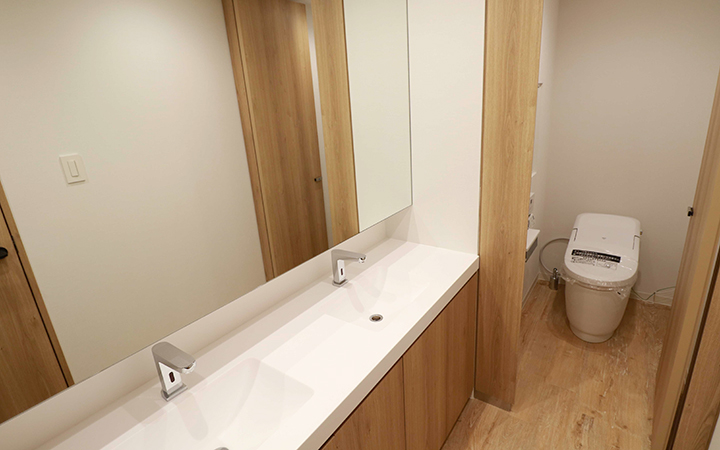 また、男女別のトイレや水回りもモダンなデザインで統一されており、従業員の皆様が日々心地よく過ごせる環境が整っています。