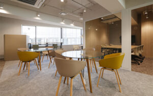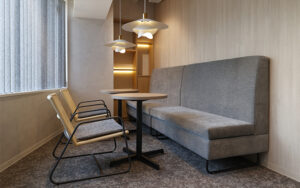 メインの執務エリアに加え、ガラスパーテーションで仕切られた会議室や、窓際に配置されたカウンター席、ゆったりとしたソファスペースなど、目的別に使い分けられる多様な空間が用意されています。大きな窓からは自然光がたっぷりと差し込み、従業員のモチベーション向上にも寄与。
