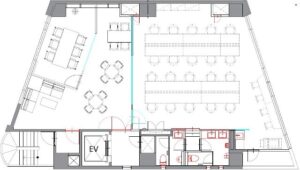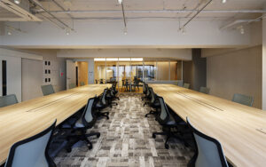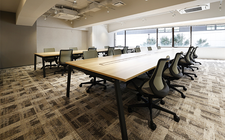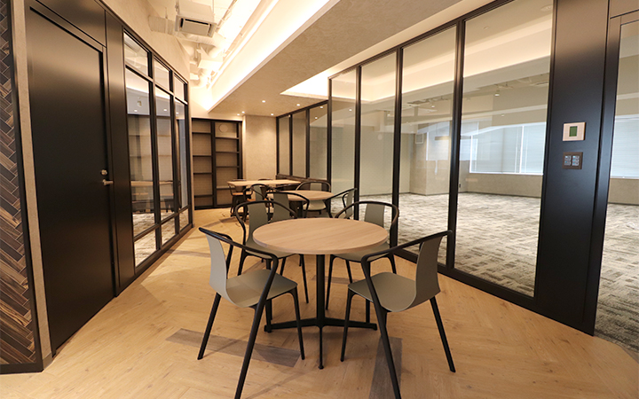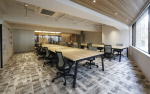 内装は2020年にフルセットアップ工事が完了し、木目調の天井ルーバーや温かみのある照明設計が、創造性を刺激するモダンな空間を演出。什器が備え付けられているため、初期コストを抑えつつ迅速に新拠点を構えたいニーズに応えます。