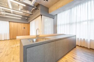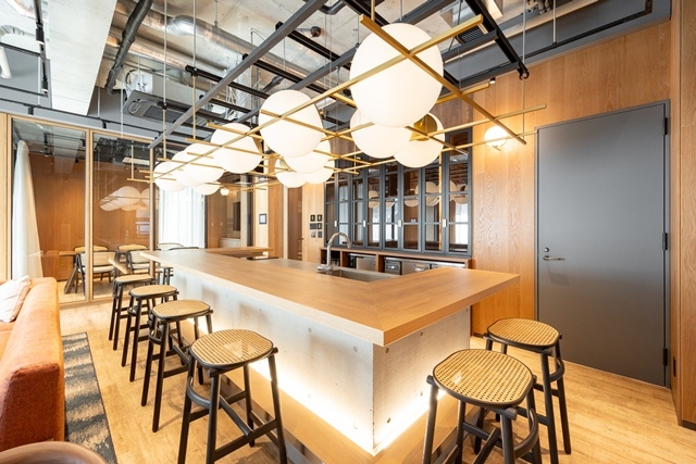 専有部内には本格的なアイランドキッチンを完備し、社内コミュニケーションを活性化させる仕掛けが随所に施されています。さらに、1階には予約制の共用会議室とラウンジ、8階には開放的なルーフテラスを備えており、ビル全体をフル活用した多様な働き方を実現できる環境が整っています。