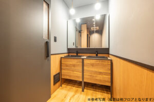 室内はコンクリート打ち放しの質感と温かみのある木目調のフローリングを組み合わせた、モダンで開放的なインダストリアルデザインが特徴です。天井高は3000mmを超えるゆとりがあり、ライン状のLED照明が空間にスタイリッシュな奥行きを与えています。