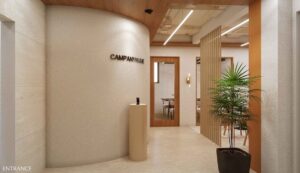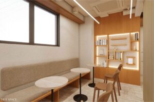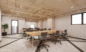 エントランスは2025年12月上旬に改修工事が完了予定で、さらに上質な空間へと生まれ変わります。内装は木目調の温かみとモダンなデザインが融合した空間となっており、ナチュラルカラーを基調とした落ち着いた雰囲気がクリエイティブな発想を促進します。