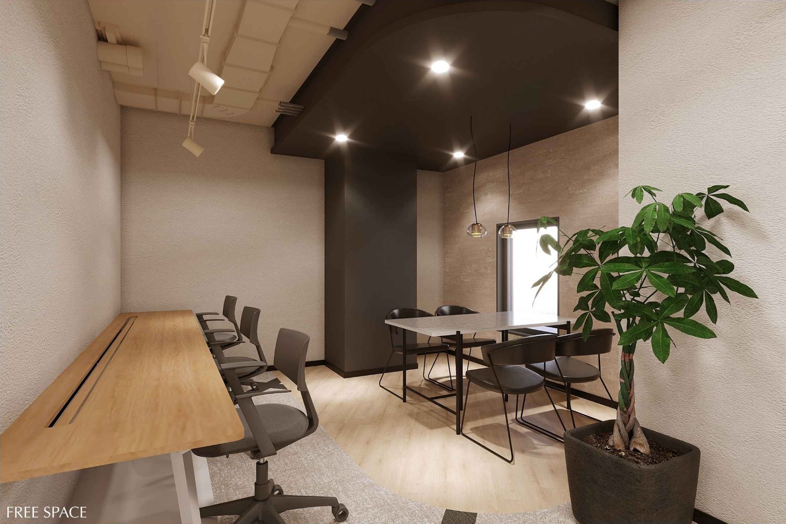 執務スペースは開放感のあるレイアウトで、デスクやチェアなどの什器が完備されているため、移転後すぐに業務を開始できます。会議室は独立した個室タイプで、重要な商談やプレゼンテーションに集中できる環境です。またフリースペースにはカウンターテーブルやソファが配置され、リラックスした雰囲気の中でミーティングやブレインストーミングが可能です。