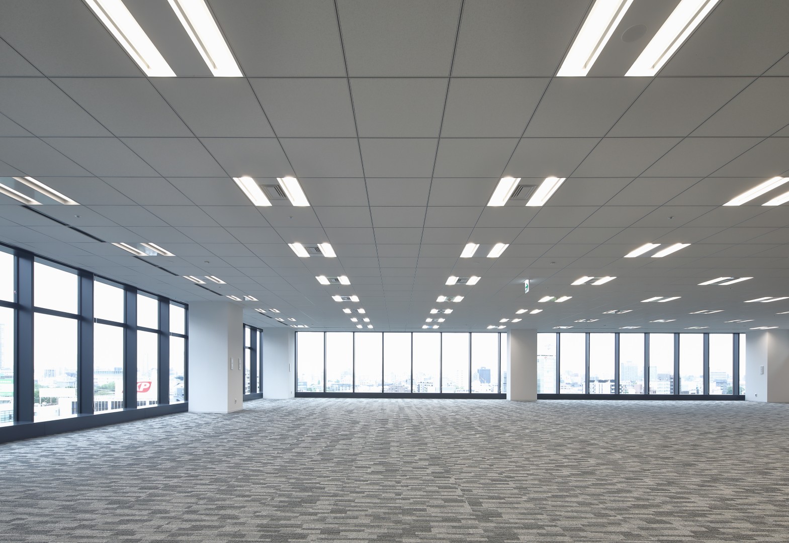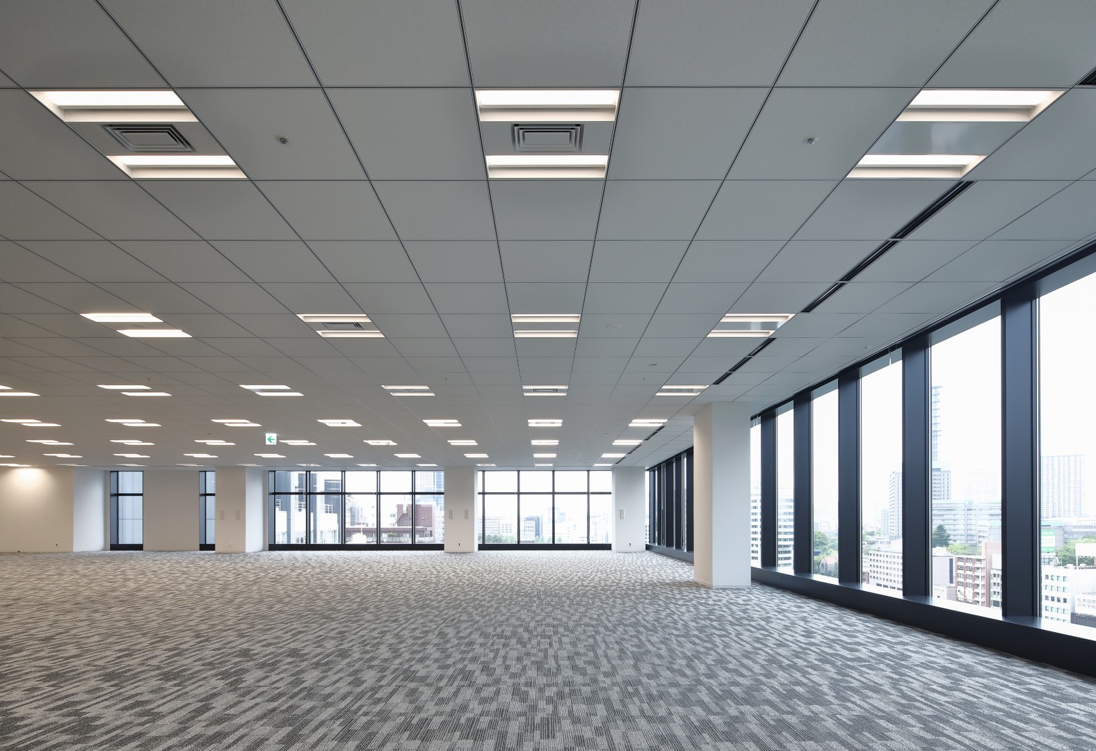 執務スペースは四方に大きな窓を配し、自然光が降り注ぐ明るく開放的な環境を実現。グリッド天井によりレイアウトの自由度が高く、企業の成長や組織変更にも柔軟に対応できます。