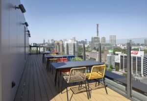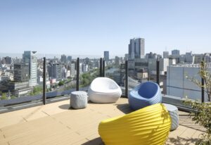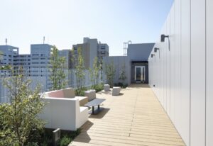 入居者専用の屋上テラスは緑に囲まれた憩いの空間で、リフレッシュやカジュアルなミーティングにも活用いただけます。