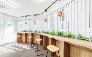 室内は窓際に沿って配置されたカウンター席や、開放感のあるガラスパーティションで仕切られた会議スペースなど、目的に応じて使い分けができるレイアウトが施されています。執務エリアは落ち着いたトーンのカーペットと木目調の壁面が、集中力と創造性をバランスよく引き出す設計です。エントランスから一歩足を踏み入れると、植栽が配されたリラックススペースが広がり、従業員同士の円滑なコミュニケーションを促進します。