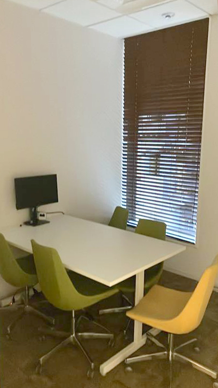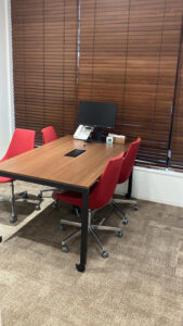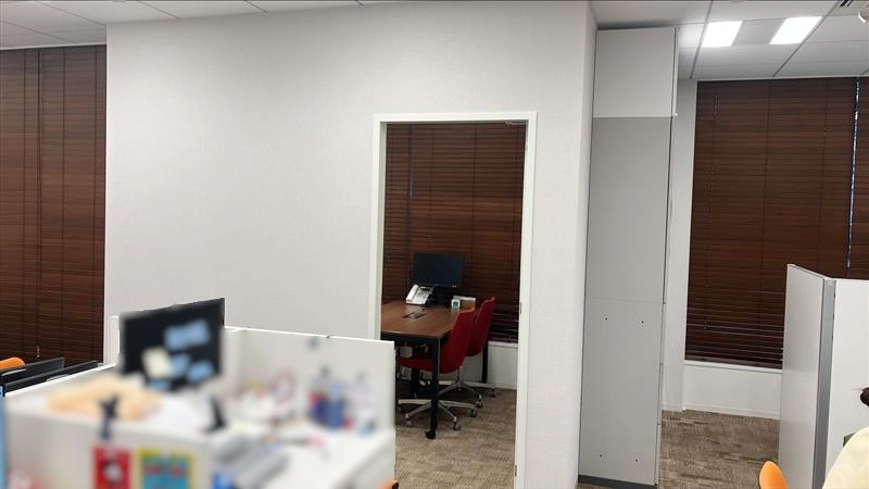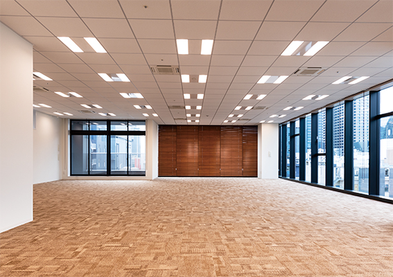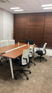 執務スペースは二面採光による豊富な自然光が特徴で、明るく開放的な環境で業務に集中できます。木製ブラインドを採用した内装は落ち着きと高級感を演出し、来客時にも自信を持ってご案内いただけます。