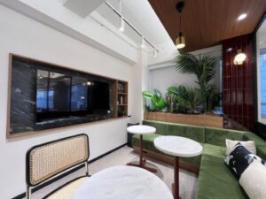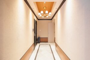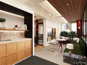 本物件は、洗練されたデザインと機能性を兼ね備えたセットアップオフィスです。エントランスから続く共用廊下は、大理石調の床材とシャンデリアで上質な雰囲気を演出し、クライアントを迎える際にも好印象を与えます。執務スペースは窓面からの自然光が差し込む明るい空間で、デスクとチェアを設置予定のため入居後スムーズに業務を開始できます。ラウンジエリアにはキッチン設備も備わり、従業員のリフレッシュやカジュアルな打ち合わせに活用いただけます。