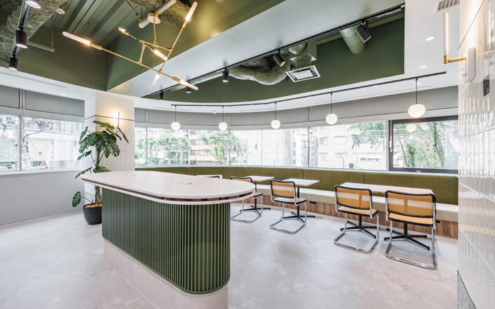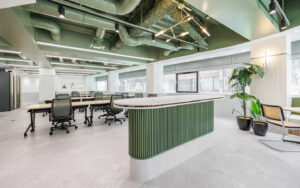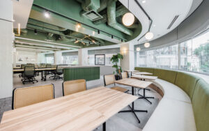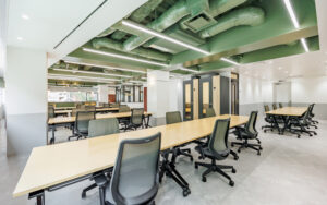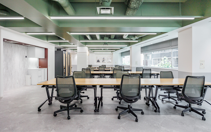 淡いグリーンを基調としたスケルトン天井とモダンな照明器具が、従業員の創造性を刺激する心地よい執務環境を提供します。