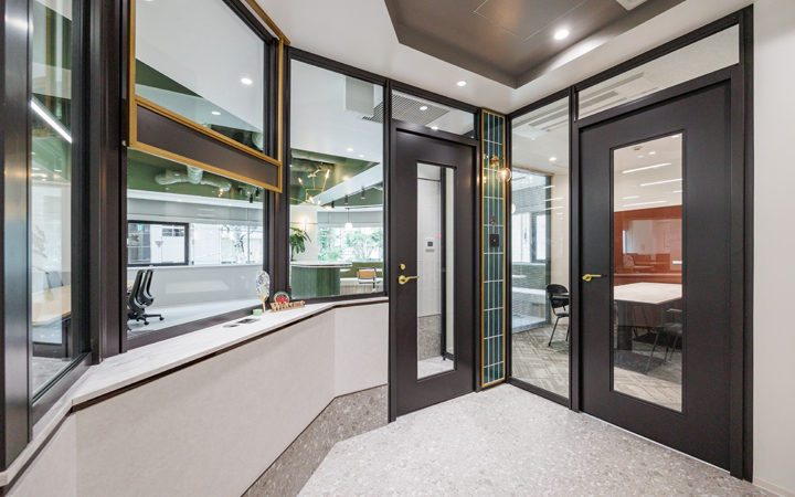 大きな窓からは自然光がたっぷりと差し込み、来訪者に対しても明るく開放的な企業イメージを印象づけることができそうです。
