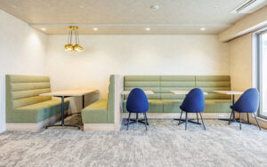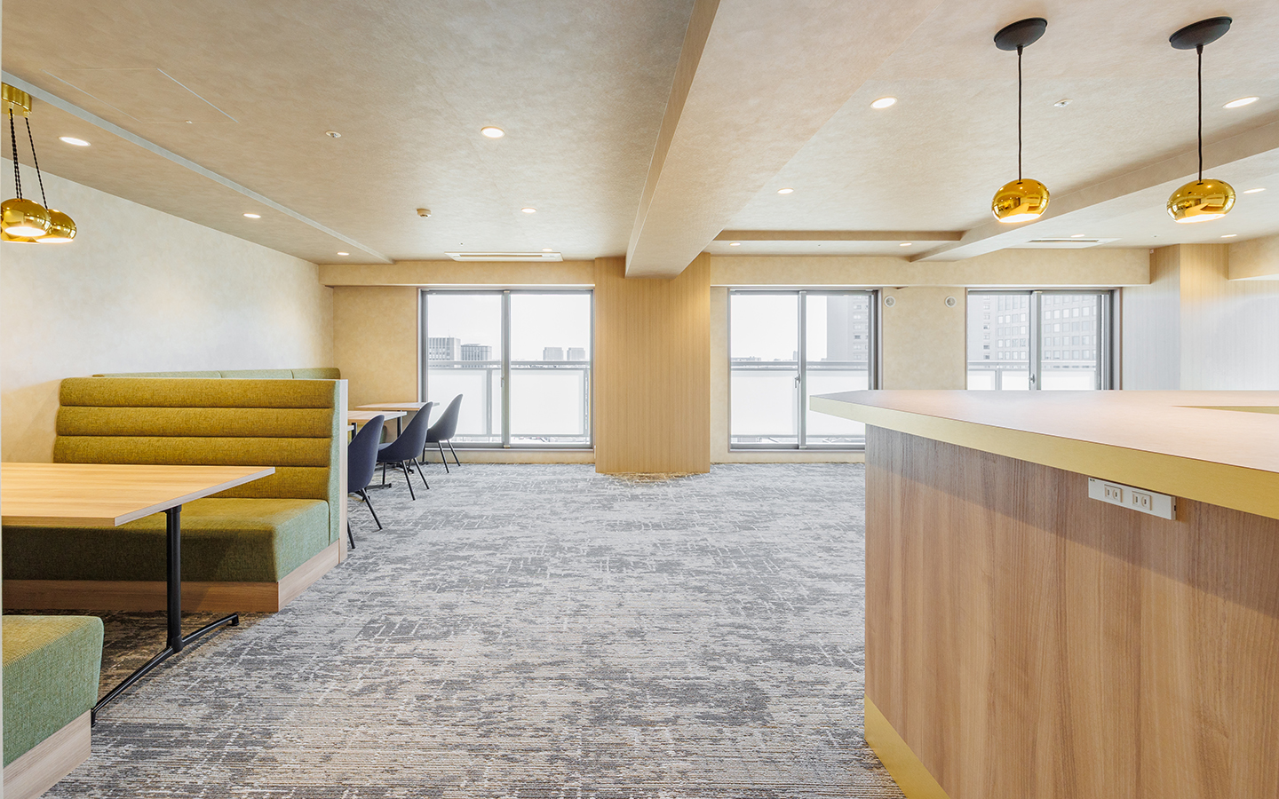 最上階に位置するため窓からの見晴らしが良く、柔らかな自然光が室内を包み込みます。室内にはカウンター席やボックス型のソファ席、さらにガラスパーテーションで仕切られた会議室が配置されており、業務内容に合わせて場所を選べる高い機能性を備えています。