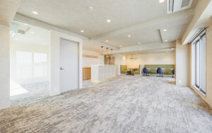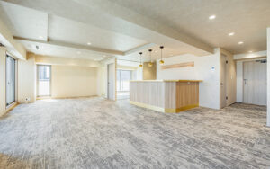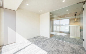 2023年末の共用部大規模リニューアルを経て、2025年には専有部のリノベーションが完了した最新鋭のセットアップオフィスです。落ち着いたベージュ調の壁面とモダンなタイルカーペットが調和し、来訪者に信頼感を与える洗練された空間を演出しています。