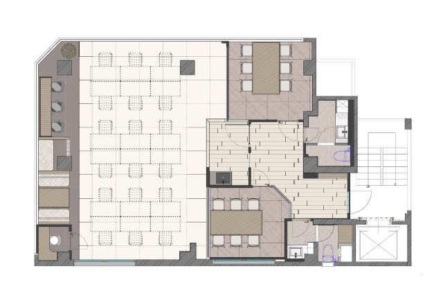 内装はグレーやベージュを基調とした落ち着いた色調で統一され、集中力を高める快適な執務空間を実現しています。