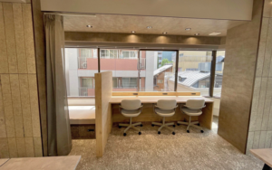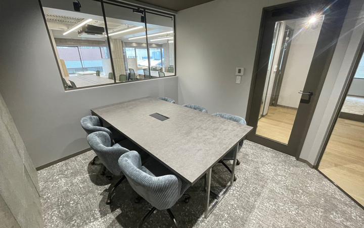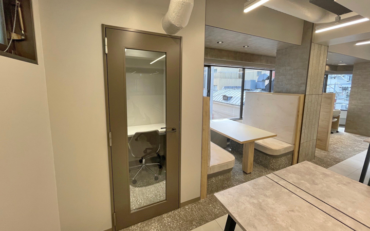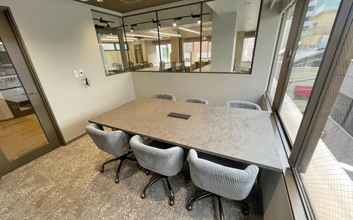 会議室はガラスパーティションで仕切られており、適度なプライバシーを確保しながらもオープンな印象を維持しています。窓際にはカウンター席も設置され、気分転換をしながらの作業にも対応可能です。フォンブースも完備されているため、Web会議や機密性の高い電話にも安心して対応できます。