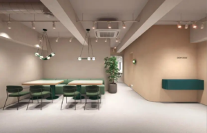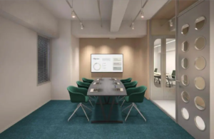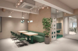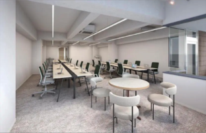 天井に施されたモダンな照明設備は、作業に最適な明るさを確保しながら、スタイリッシュな雰囲気を醸し出しています。会議室には大型モニターが設置され、プレゼンテーションや商談をスムーズに進行できます。さらに、リフレッシュスペースには観葉植物が配置され、緑豊かな環境で創造的な発想を促します。