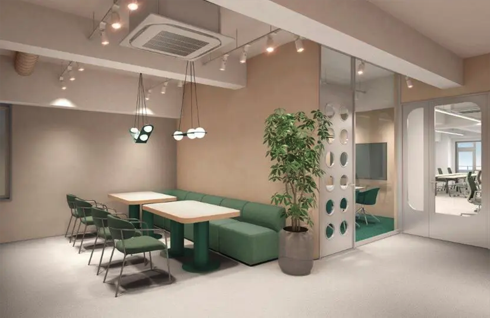 6名用の会議室とテレカンブース2室を備えており、対面・オンライン双方のミーティングに柔軟に対応できます。グリーンを基調とした落ち着いた内装は、従業員のモチベーション向上にも寄与し、来訪者にも好印象を与えます。