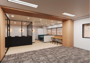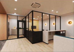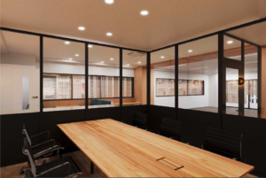 本物件の最大の魅力は、ブラックフレームのガラスパーティションを活かした洗練された空間デザインです。エントランスから執務エリアまで、統一感のあるモダンなデザインが来訪者に好印象を与え、企業のブランドイメージ向上に貢献します。