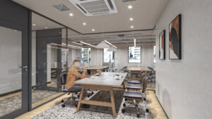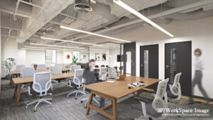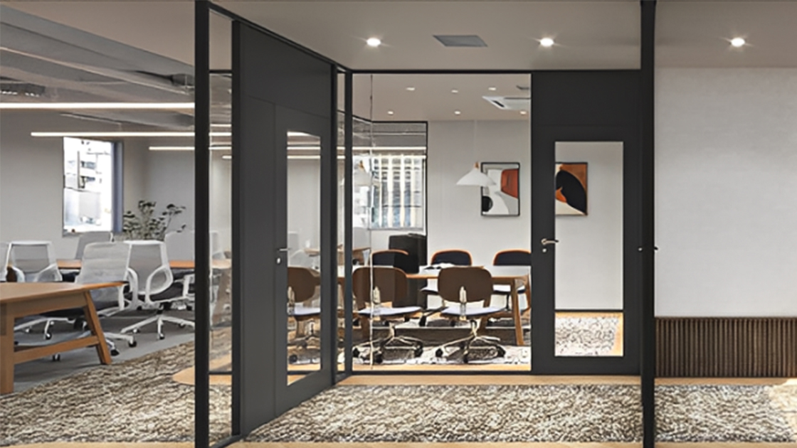 内装は木目調のデスクとモダンな家具で統一され、来訪者に洗練された印象を与えます。ワークスペースは開放的な設計で、ガラス張りの会議室がオフィス全体に明るさをもたらします。