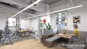 リフレッシュエリアにはソファ席を配置し、従業員がリラックスできる空間を確保。