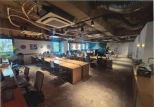 開放的なレイアウトは、チーム間のコミュニケーションを促進し、フレキシブルな働き方を実現します。自然光が差し込む明るい空間は、社員のモチベーション向上にも寄与します。天井には配管や構造が見えるデザインが採用されており、洗練された印象を演出します。