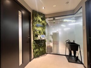 内装は高いデザイン性を誇り、緑を随所に配置したエントランスや、露出配管の天井が開放感を演出するワークスペースなど、創造性を刺激する空間が魅力です。