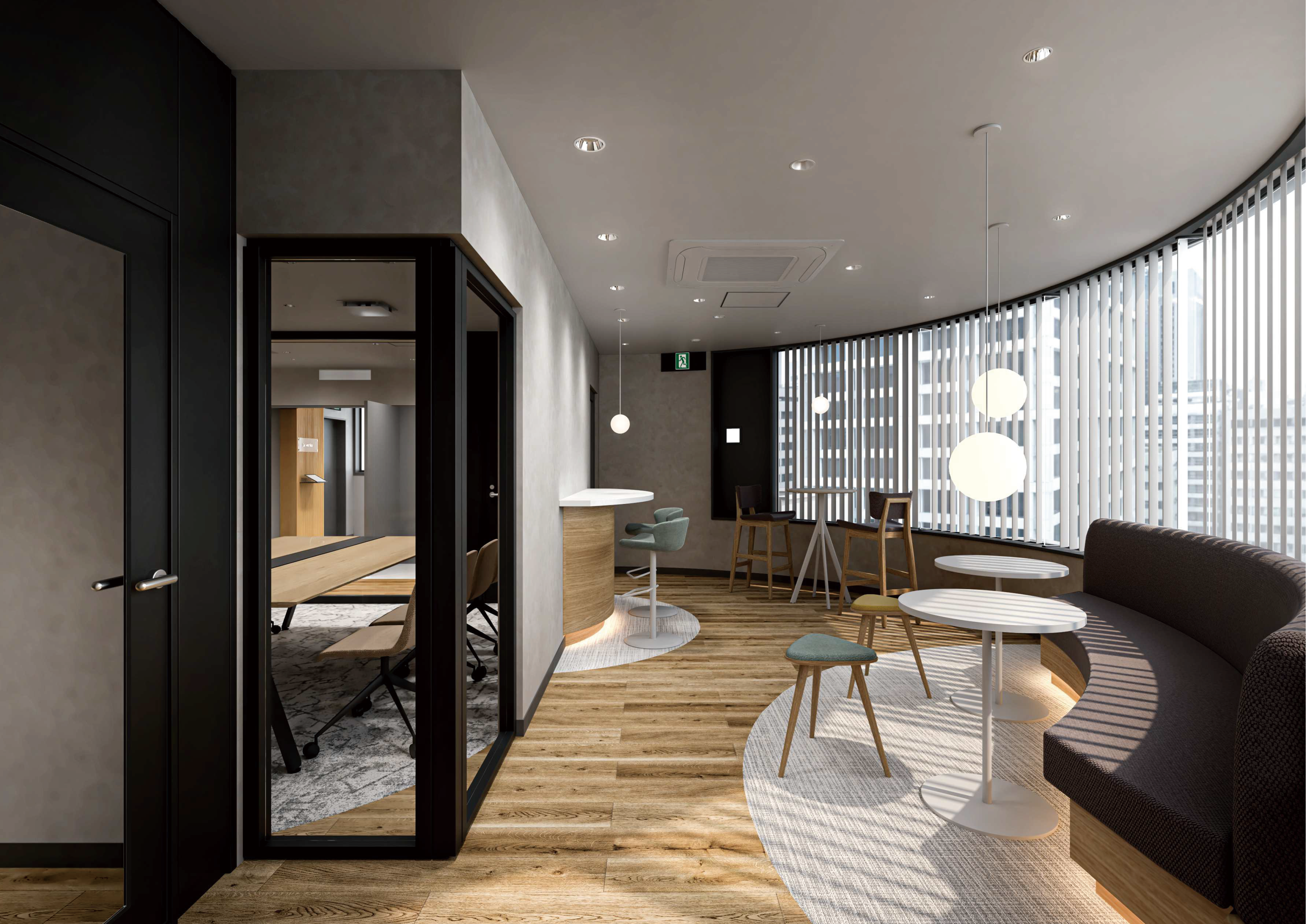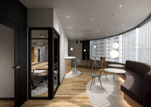 窓から光が差し込むコミュニケーションエリアも完備されており、集中と緩和のバランスが取れた理想的なビジネス拠点といえます。