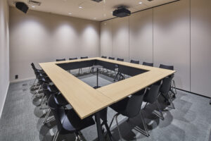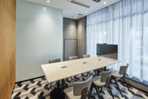 大きな窓から差し込む自然光は、執務空間全体を明るく照らし、従業員の集中力向上とストレス軽減に貢献します。タイルカーペット仕様の床は歩行音を吸収し、静かで落ち着いた環境を実現。ライティングレールにより、用途や時間帯に応じた最適な照明環境の構築が可能です。