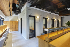 スケルトン天井による開放感と、充実した共用設備により、限られたスペースでも快適な執務環境を実現しています。