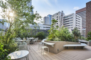 特に注目すべきは、3つの異なるコンセプトの共用ラウンジです。Social Loungeではカジュアルな打ち合わせや来客対応、Buffer Loungeでは気分転換やリフレッシュ、Work Loungeでは集中して作業に取り組むなど、多様な働き方に対応できます。また、ガーデンテラスは、都心では貴重な屋外スペースとして、従業員の憩いの場としても活用いただけます。