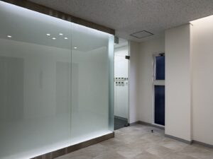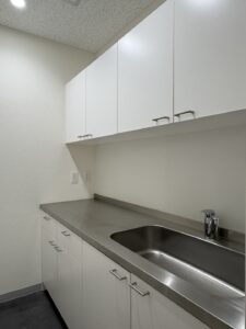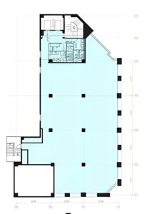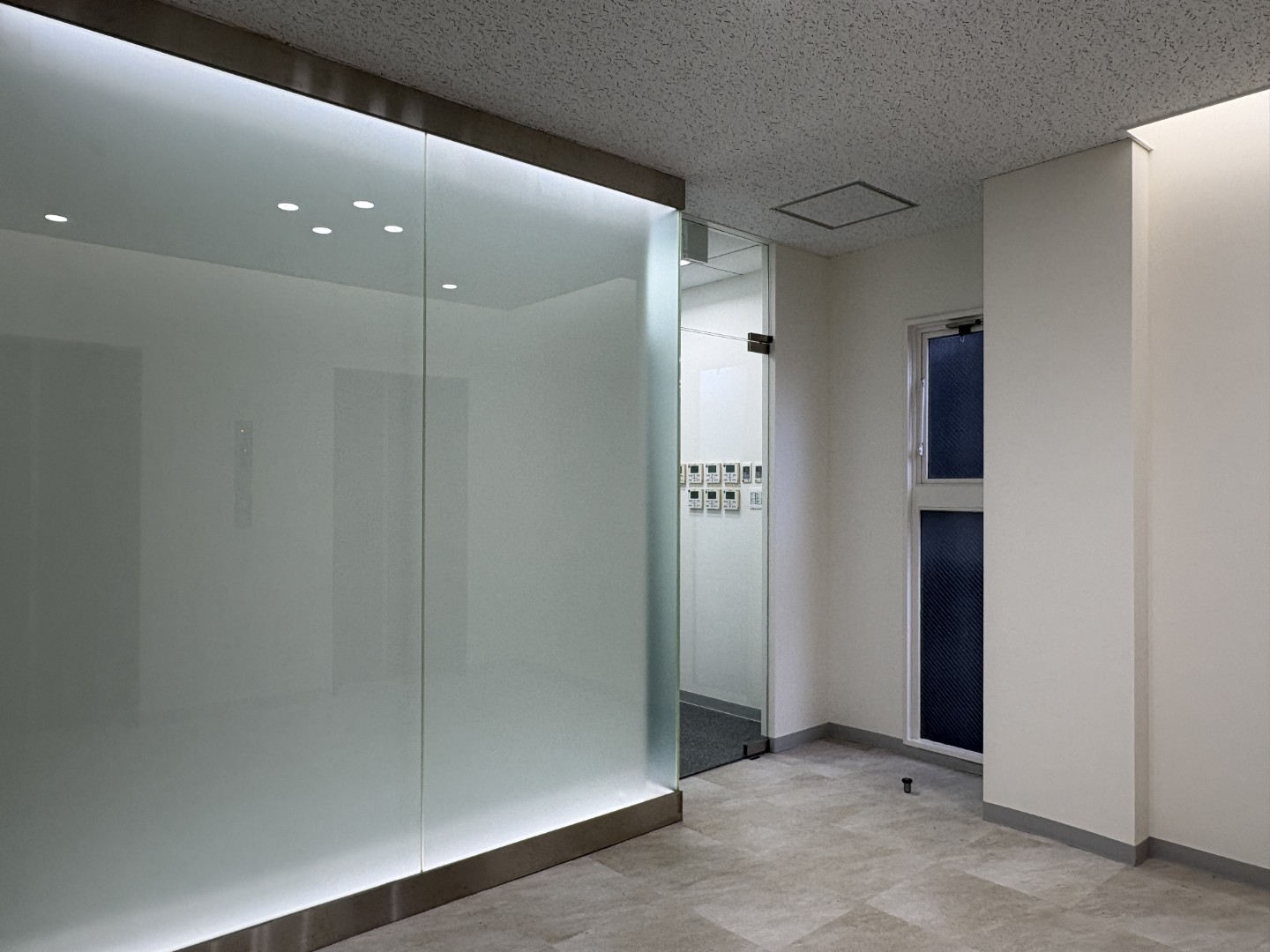 建物内部は、自然光が差し込む明るいエントランスホールから始まり、来客の第一印象を大きく左右するエントランス空間は清潔感と洗練された雰囲気を演出しています。執務スペースは、広々とした無駄のないレイアウトが可能で、デスク配置の自由度が高く、チーム編成の変更にも柔軟に対応できます。