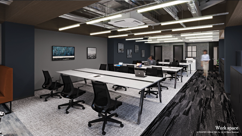 執務エリアには整然とデスクが配置され、集中しやすいレイアウトとしながら、リフレッシュできるラウンジスペースも確保しています。
