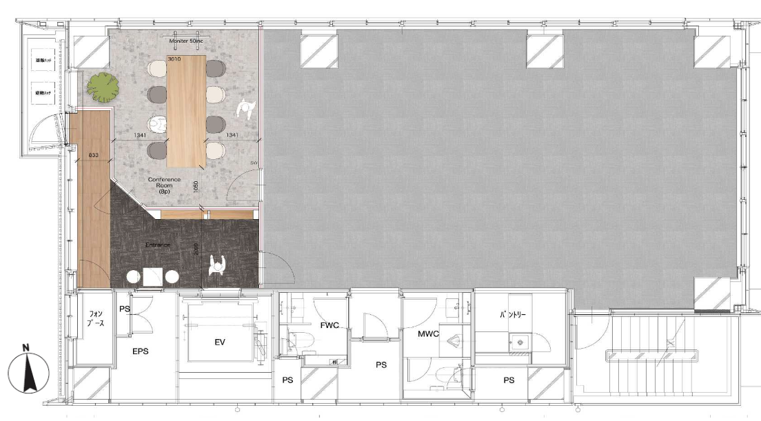 約44坪のフレキシブルな空間に、エントランス・8名用会議室をセットアップ済み。