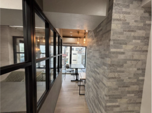 内装には天然石調の壁材とスタイリッシュなブラックフレームの窓が採用され、来訪者に強い印象を与える上質な空間を実現しています。