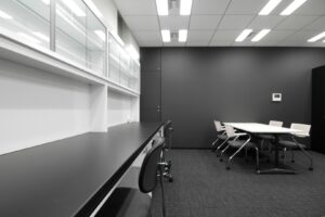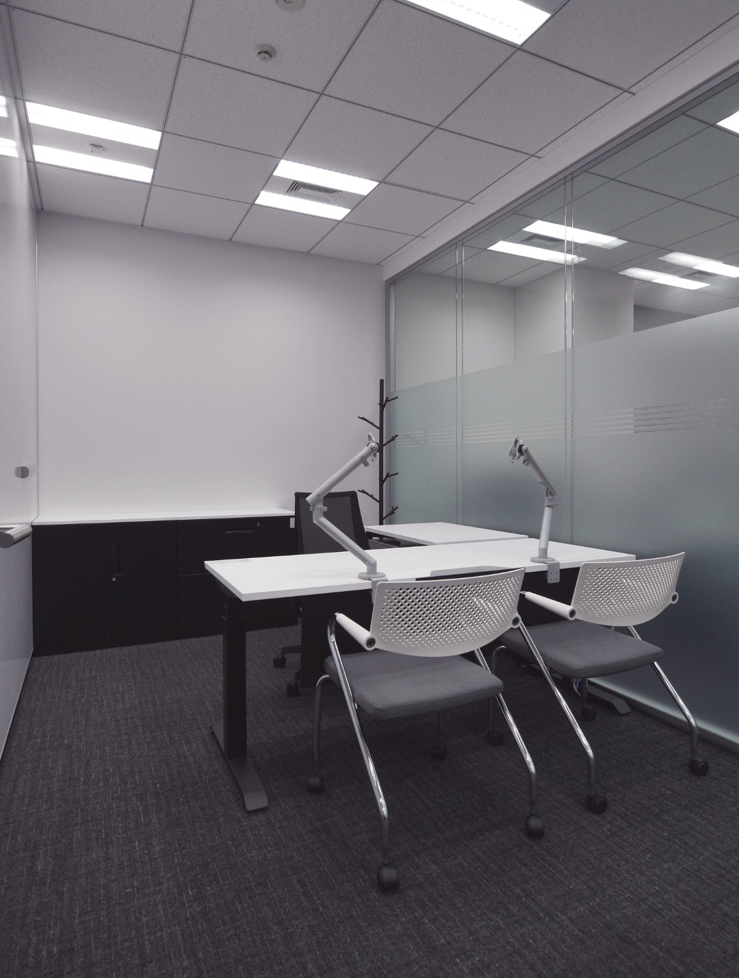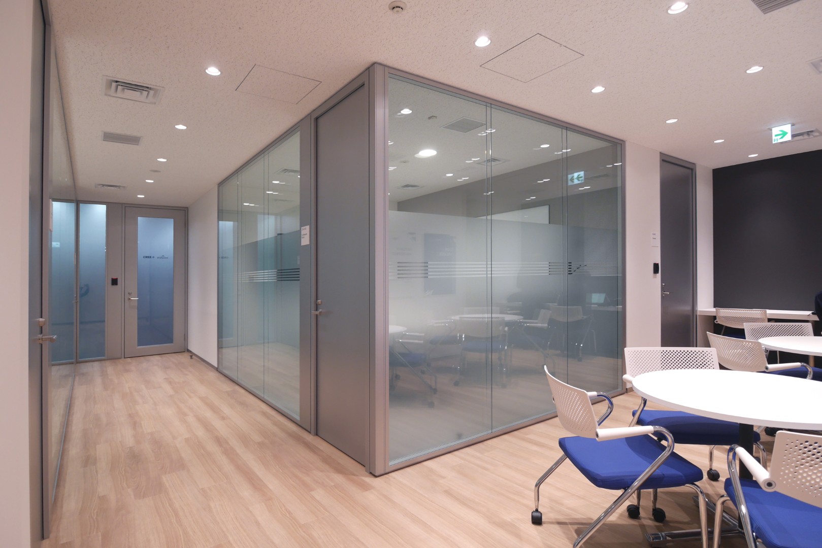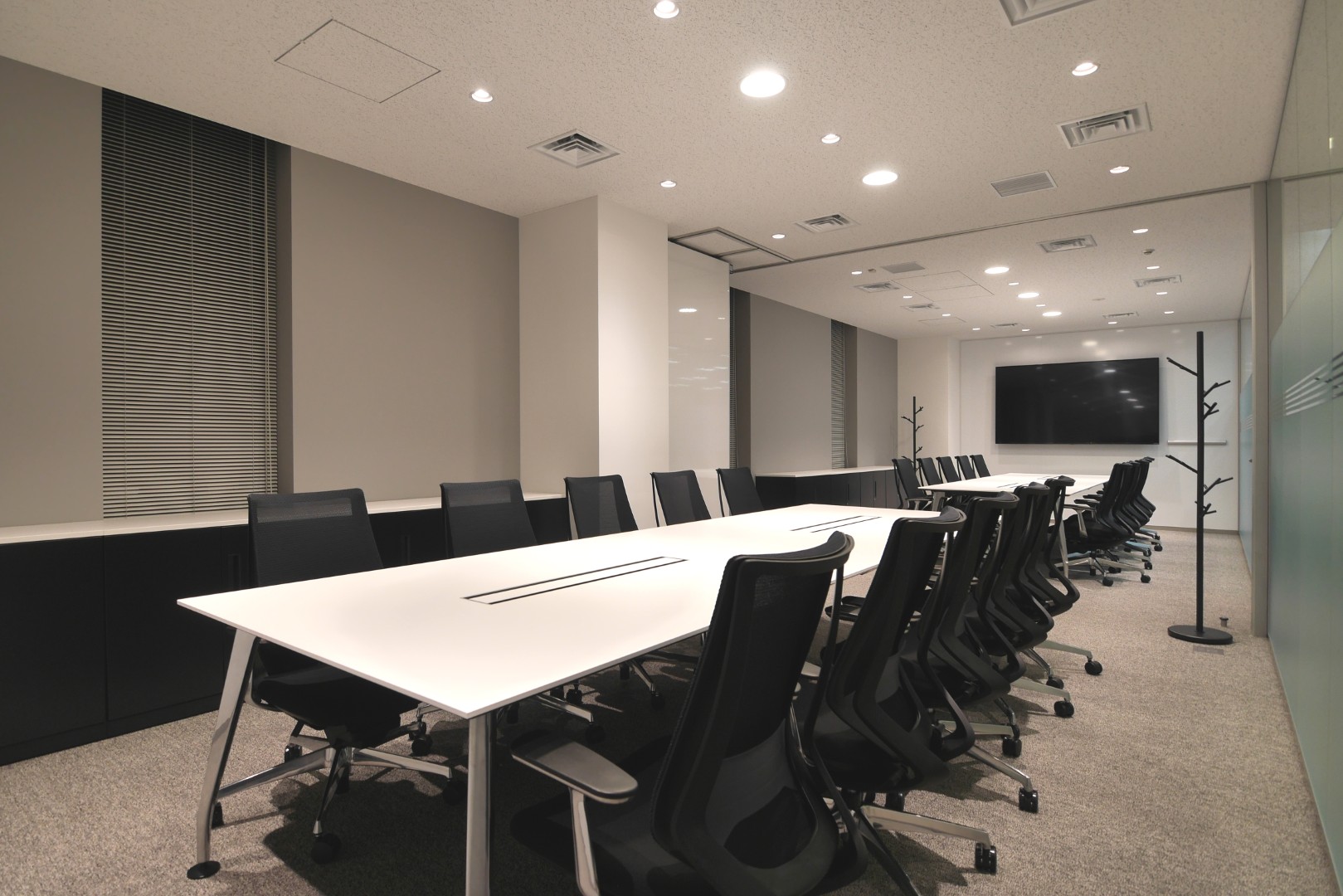 内装は白とグレーを基調としたシックなデザインで統一され、落ち着いた雰囲気の中で業務に集中できる環境が整っています。10名規模の会議室が2室設けられており、クライアントとの重要な商談や社内ミーティングなど、様々なシーンで活用できます。また、執務個室が2室あることで、機密性の高い業務や集中作業が必要な際にも最適な環境を提供します。