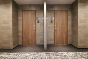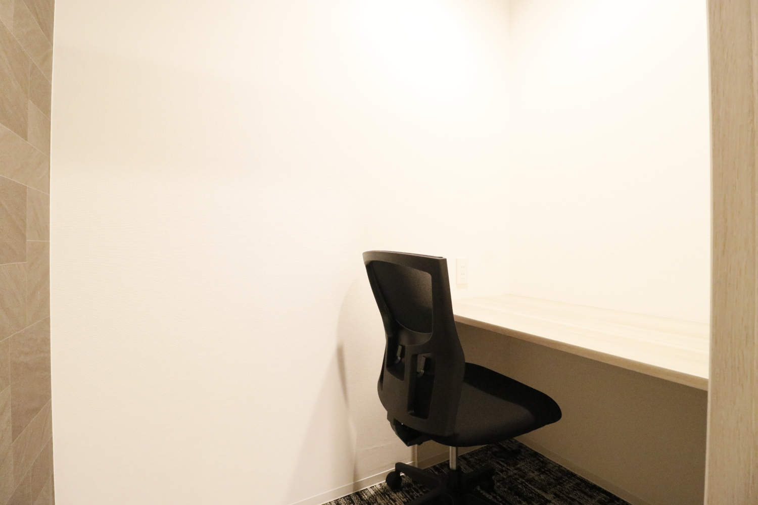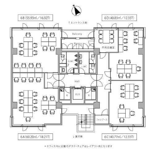 共用部には石目調の高級感ある内装が施され、木目調のドアとの組み合わせが上質な空間を演出しています。また、共用会議室は明るく開放的な空間で、大型モニターも設置されており、プレゼンテーションや打ち合わせに最適です。フォンブースも完備されているため、プライバシーを確保した通話や集中作業にも対応できます。