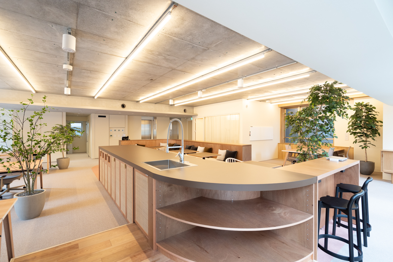 ナチュラルな素材感と先進的な機能性が調和した、新しいワークプレイスの形がここにあります。エントランスの奥行きのあるピロティ空間には豊かな緑が配され、木の温もりを感じるロビーが訪れる人々を優しく迎えます。囲炉裏的広場を中心としたレイアウトは、チームワークの醸成を促進する設計思想に基づいています。オープンキッチンやミーティングコーナーなど、多様なワークシーンに対応する空間構成により、フレキシブルな働き方を実現。調光調色LED照明や昼光センサーによる自動調光など、最新の設備仕様がワーカーの快適性を高めます。さらに、省エネ性能の強化により環境負荷を低減し、企業のESG経営をサポートします。